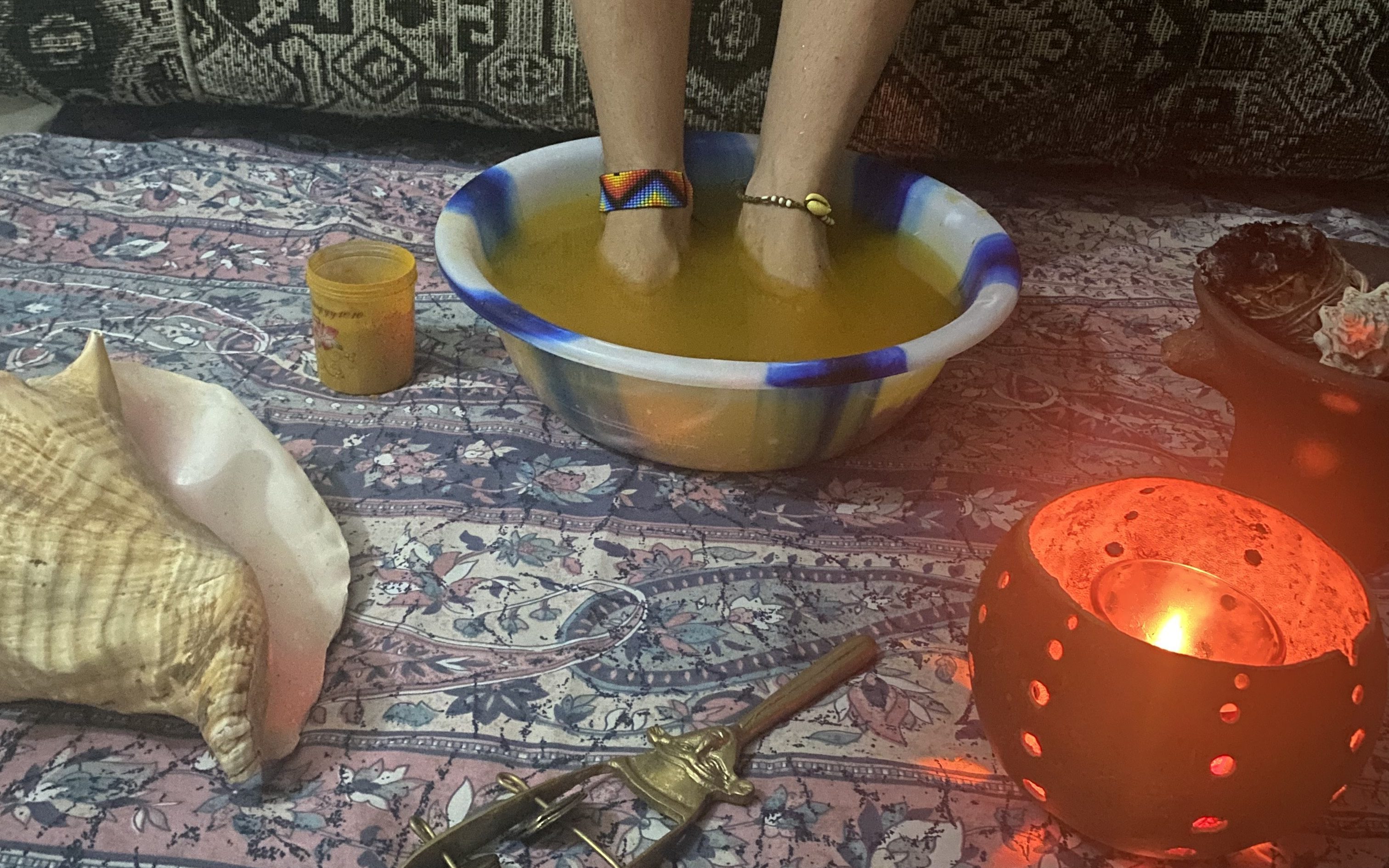 Estamos rodeadxs de toxinas ambientales que entran en nuestro cuerpo diariamente toxificandonos, el higado es el organo encargado en limpiar estas toxinas (toxinas emocionales tambien) entonces la curcumina, principio activo de la curcuma es un elemento que ayuda muchisimo en los procesos de nuestro higado, ayuda a la depresión y afecciones de la piel tales como soriasis y dermatitis, asique sabiendo que los pies son un centro de mando para trabajar afecciones en los organos del cuerpo, este asiento de agua caliente con curcuma y pimienta negra para activar la curcumina es sin duda un ritual maravilloso que ademas nos conecta con el simbolismo esoterico ancestral de la cultura hindú y su magia-medicina holistica.
